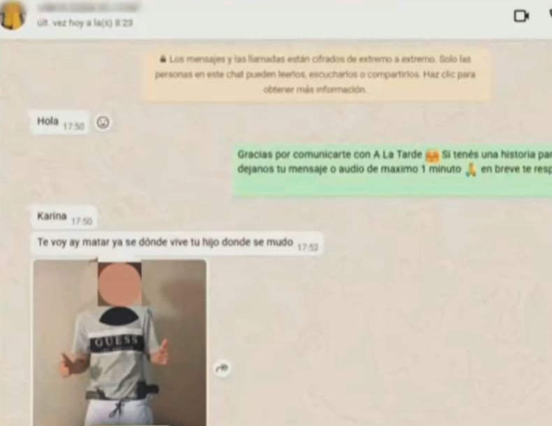 La amenaza fue recibida en el whatsapp que utiliza la producción de A la Tarde (América TV) donde la audiencia suele contar sus historias de vida para compartir al aire: “Karina, te voy a matar. Ya sé donde vive tu hijo, donde se mudó“, rezaba la amenaza a la conductora. Los mensajes fueron acompañados con la foto de un arma. “Dejá de meterlo a Axel Caniggia. Te la voy a descargar, vas a ver, en la cabeza“, siguió amenazando el anónimo.