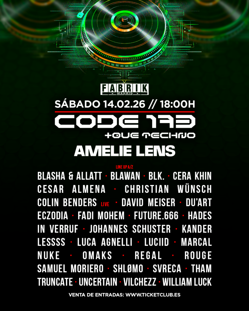 El gran reclamo de la noche será el regreso de Amelie Lens a FABRIK, casi tres años después de su última visita al macroclub madrileño, que tuvo lugar en marzo de 2023. La fundadora de Exhale es hoy una de las figuras imprescindibles del techno global, y cada una de sus apariciones en CODE se convierte en un acontecimiento con peso propio.