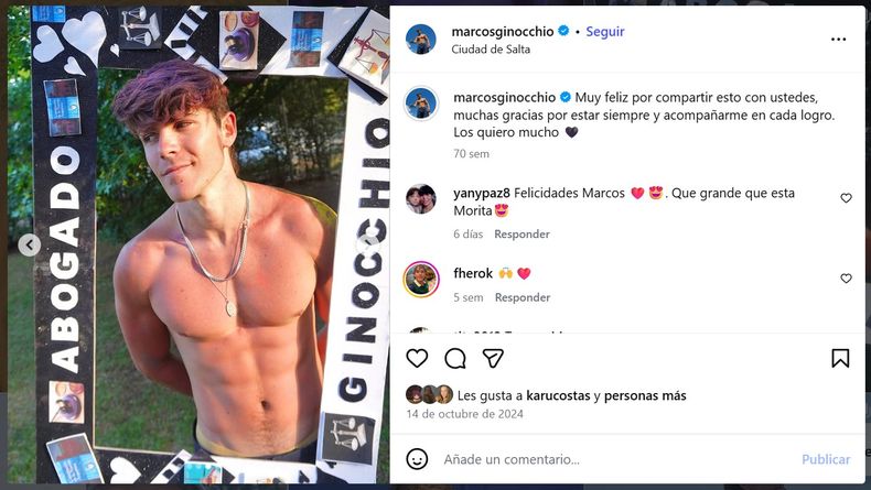 Marcos Ginocchio salió de la casa de Gran Hermano en 2022 con más de $15 millones y una vivienda. El salteño de 26 años eligió mantener un perfil bajo durante su estadía en la casa más famosa del país y no cambió su actitud tras su triunfo. Viajó con su padre a Bariloche y se recibió de abogado en la Universidad Nacional de Salta (UNSa).
