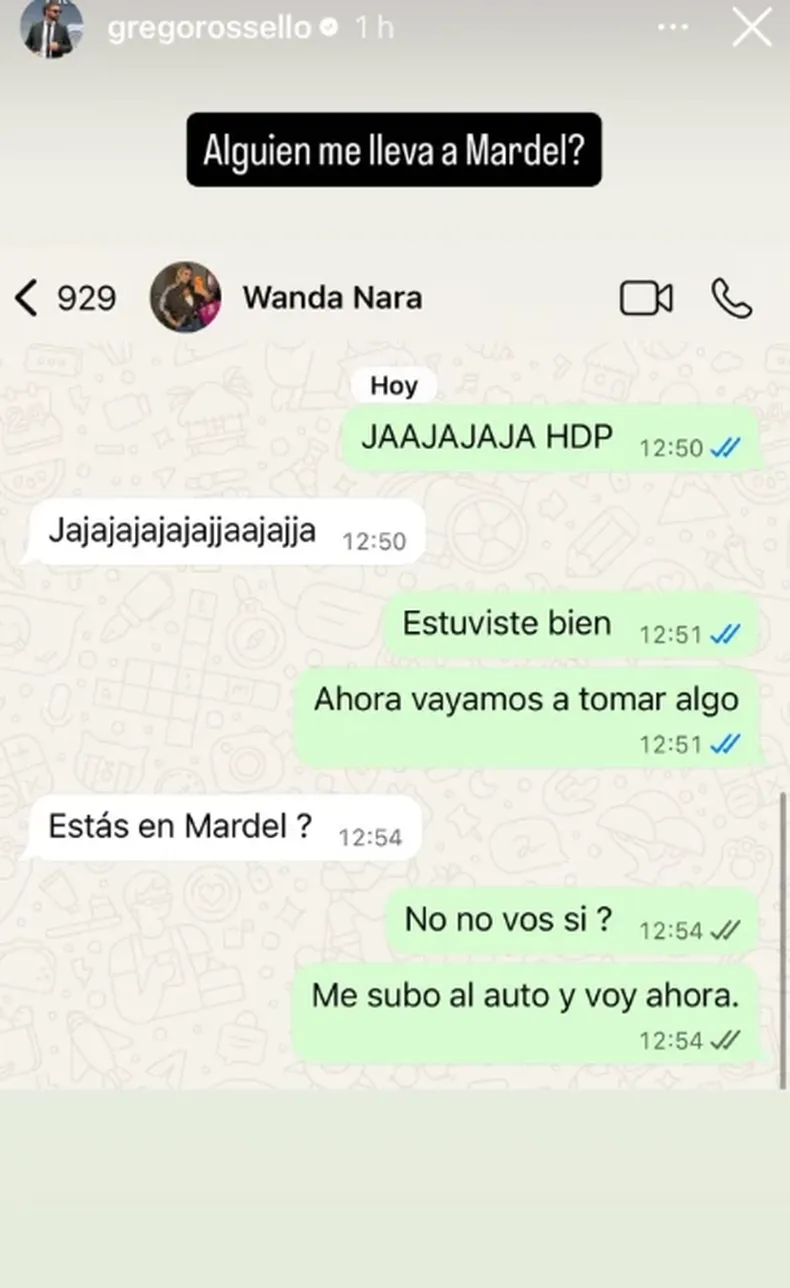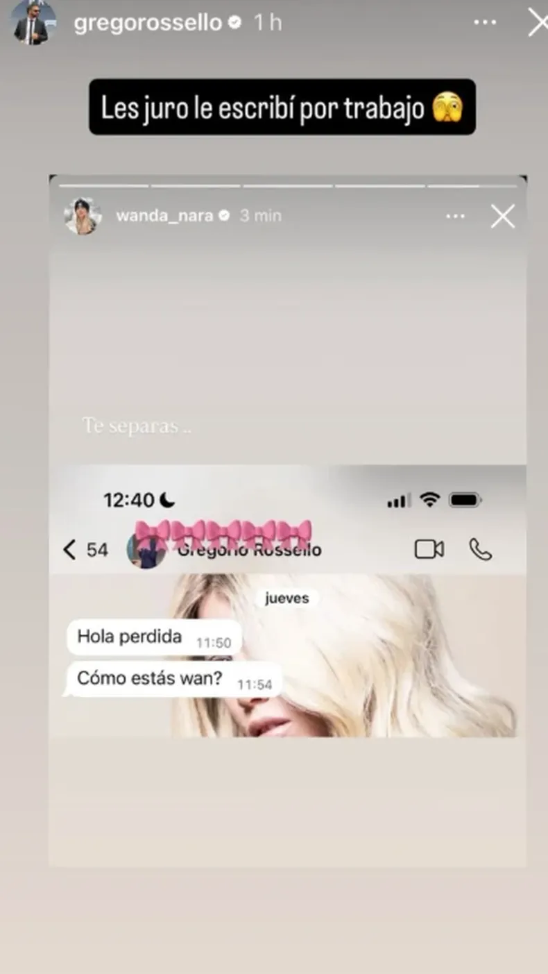 Desde sus historias, Wanda compartió una captura de WhatsApp en la que se leía un saludo directo y sin vueltas: un “Hola perdida”, seguido por un mensaje preguntando cómo estaba. Aunque intentó cubrir el nombre del contacto con emojis, la identidad quedó a la vista y se trataba de Grego Rossello.