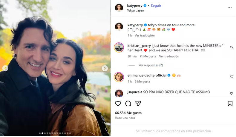 La cantante Katy Perry, de 41 años, confirmó el romance con el exprimer ministro de Canadá Justin Trudeau, de 53 años, a través de románticas fotos publicadas en redes sociales en un viaje a Japón.