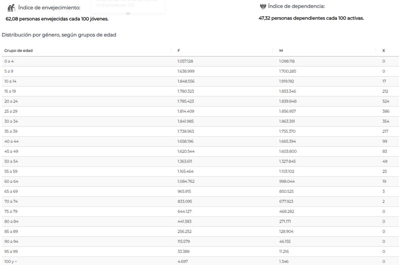 El Índice de envejecimiento, medida que marca la relación entre la cantidad de personas adultas mayores (+65) y la cantidad de niños y jóvenes (-15), en argentina es de 62,08 personas envejecidas cada 100 jóvenes.